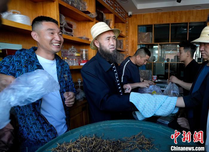 圖為6月13日,蟲草商通過揣袖議價的方式購買冬蟲夏草。中新社記者 李林 攝