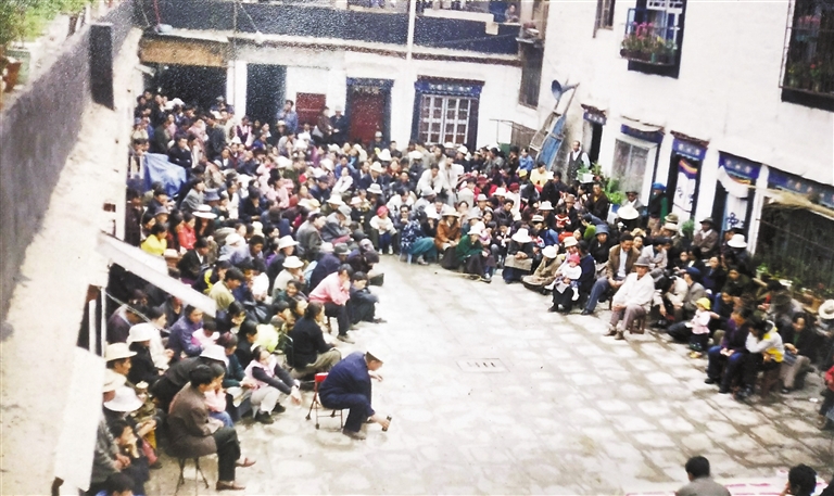 在當時拍的另一張照片上,幾十位居民擠在過道里準備投票。“那時候院子小,選舉時得側著身子站?!钡录扛禄貞浀?,“院子窄小,雨天積水,但絲毫不影響大家參與社區(qū)事務的熱情?!闭掌囊唤牵?3歲的普布普赤正躲在母親身后好奇張望,如今她41歲,已成長為大院的戶長。