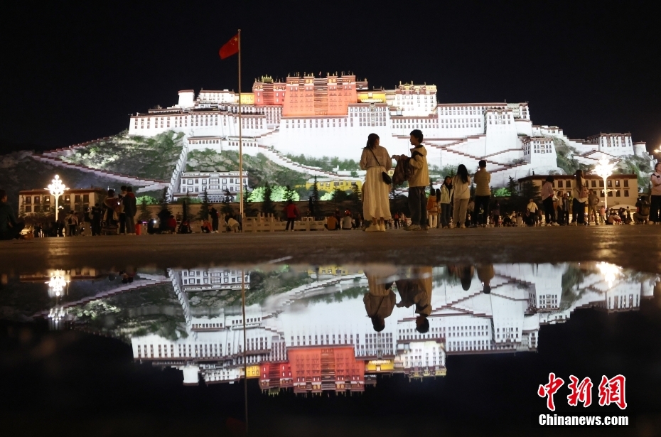 7月7日晚,西藏拉薩布達拉宮廣場燈光明亮、噴泉綻放,吸引當?shù)孛癖娕c遠方游客前來觀賞美景。