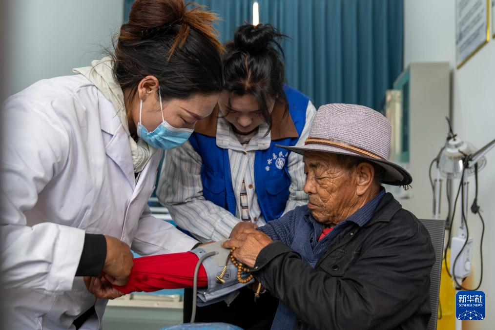 7月17日,村醫(yī)德慶拉姆在三有村幸福驛站日間照料室里為老人測量血壓。新華社記者 旦增尼瑪曲珠 攝
