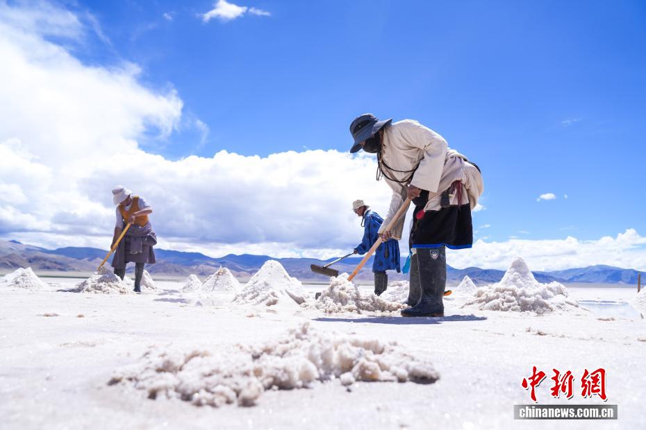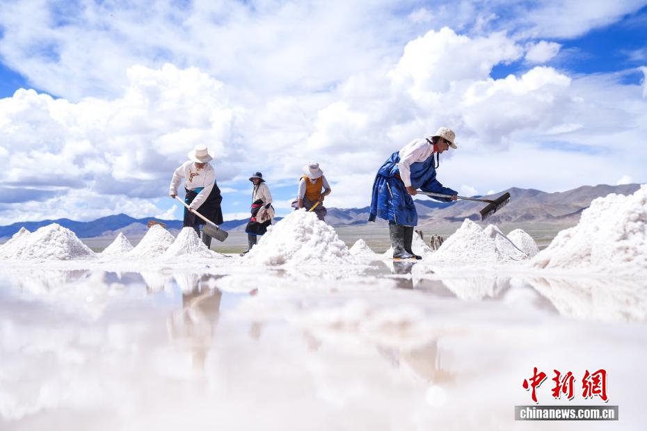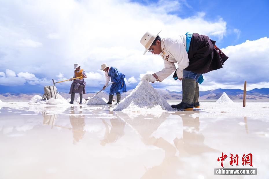 7月20日,在西藏阿里地區(qū)革吉縣鹽湖鄉(xiāng),民眾在鹽湖中采制粗鹽巴。一千多年前,阿里地區(qū)有50多家駐扎的鹽幫,將自然鹽用羊馱牛背邊放牧邊運輸?shù)姆绞?,運送到普蘭、日喀則、印度、尼泊爾等地,并用以物易物的方式換回青稞、磚茶、布料等日常生活所需的物品,從而孕育了遠負盛名的“鹽羊古道”傳奇。近年來,當(dāng)?shù)亻_辦粗鹽巴加工廠、打造“鹽羊古道”旅游品牌等方式,使千年“鹽羊古道”煥發(fā)新生機。中新社記者 張祥毅 攝