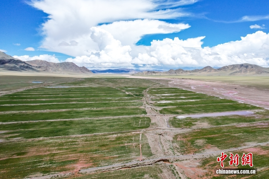 7月20日,航拍西藏阿里地區(qū)革吉縣文布當桑鄉(xiāng)的人工種草基地。為解決當?shù)囟旧笥貌堇щy,減輕天然草場壓力,2016年起文布當桑鄉(xiāng)規(guī)劃建設(shè)人工種草基地。截至2024年,已種植人工草場3590畝,草業(yè)收入229.3萬元人民幣,有效帶動當?shù)剞r(nóng)牧民就業(yè)創(chuàng)收和推動生態(tài)可持續(xù)發(fā)展。(無人機照片)中新社記者 張祥毅 攝
