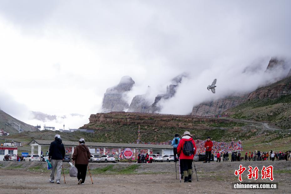 7月21日,游客在岡仁波齊山腳下的經(jīng)幡廣場(chǎng)打卡拍照。岡仁波齊位于西藏阿里地區(qū)普蘭縣境內(nèi),是岡底斯山的主峰,也是藏傳佛教的神山之一,每年吸引眾多信徒前往轉(zhuǎn)山,并衍生出徒步旅行的經(jīng)典路線。每年來(lái)自國(guó)內(nèi)外的徒步旅行者為當(dāng)?shù)貏?chuàng)造就業(yè)機(jī)會(huì)的同時(shí),也推動(dòng)了文旅產(chǎn)業(yè)的發(fā)展。中新社記者 張祥毅 攝