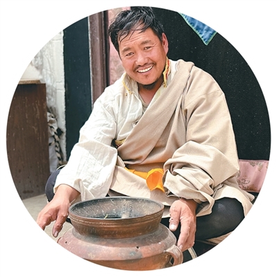 剛開始學習這門技藝,我就跟著舅舅爬上村旁海拔4000多米的山頂。只有那里,才有我們需要的優(yōu)質(zhì)黏土。舅舅告訴我:“桑珠,這黏土啊,是陶器的命根子。山頂?shù)耐磷罴毮仯ば宰?,像揉好的面團一樣柔韌,可塑性最強。”我從取土開始,一點一點地學習。慢慢地,泥土在我手里聽話了,碗、罐、壺……這些實用又好看的陶器雛形,逐漸在我手中誕生。