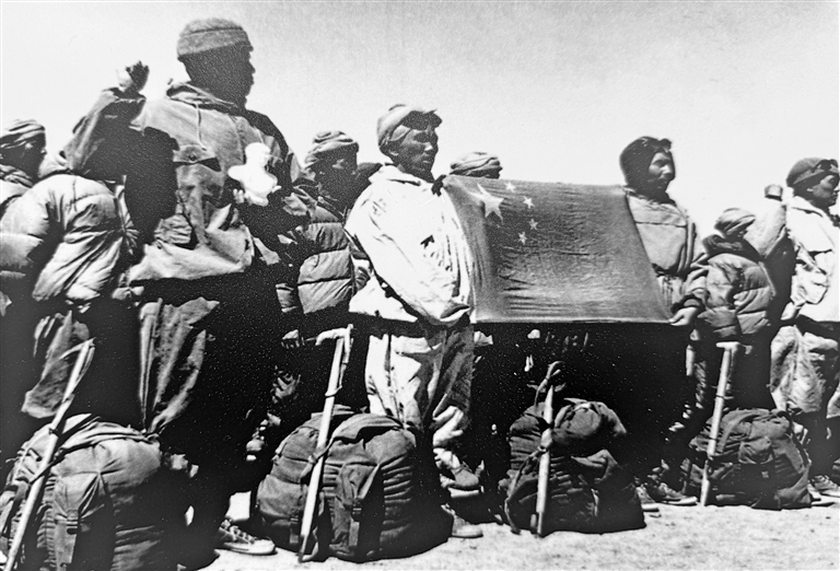 1975年5月28日,《西藏日報(bào)》頭版頭條刊發(fā)新華社消息《我國登山隊(duì)從北坡勝利登上珠穆朗瑪峰》和評(píng)論《敢于攀登高峰》。消息寫道:“九名男女登山運(yùn)動(dòng)員在珠峰峰頂展開了鮮艷的五星紅旗,豎立了一個(gè)寫有‘中華人民共和國登山隊(duì)’字樣的三米高的紅色金屬測量覘標(biāo),拍攝了頂峰的照片和影片,并測量了頂峰覆雪深度,采集了冰雪樣品和巖石標(biāo)本,還做了無線電遙測心電圖,為我國精確測定珠穆朗瑪峰的高程和有關(guān)科學(xué)研究創(chuàng)造了非常重要的條件,提供了十分珍貴的資料。”
