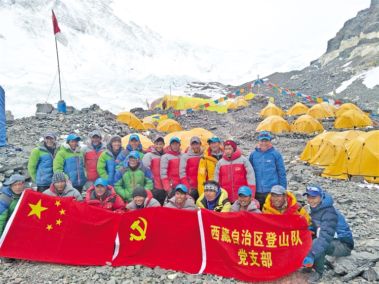 2017年,西藏自治區(qū)登山隊(duì)隊(duì)員在珠峰腳下舉行主題黨日活動(dòng)。