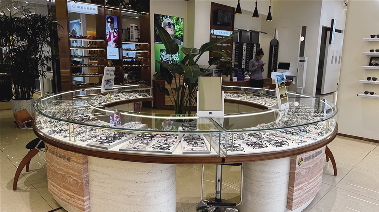 在南樓一層,瑞幸咖啡的藍(lán)色招牌與霸王茶姬的紅色燈籠相映成趣,構(gòu)筑起高原最強(qiáng)的咖啡茶飲矩陣。澳免國(guó)際美妝區(qū)內(nèi),蘭蔻、雅詩(shī)蘭黛等全球品牌專柜整齊陳列,產(chǎn)品與區(qū)外同步上新且價(jià)格一致。明廊永視眼鏡店的乳白色柜臺(tái)前,驗(yàn)光設(shè)備閃爍著科技微光,負(fù)責(zé)人彭春永介紹:“升級(jí)后加裝了藏式紋樣屏風(fēng),自動(dòng)門和LED屏讓老店煥發(fā)新顏。”