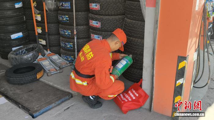 圖為消防隊員正在仔細檢查店內(nèi)消防器材是否完好有效。林芝市森林消防支隊供圖