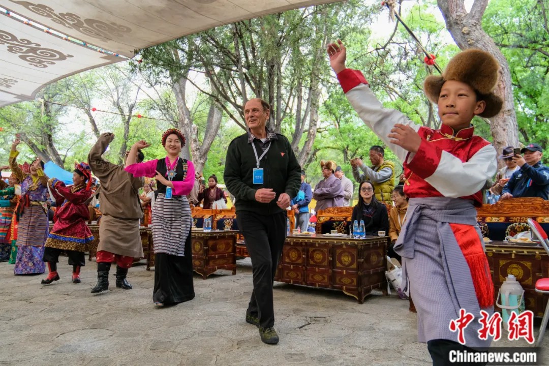 2023年5月19日,柯馬凱在拉薩羅布林卡聽藏戲,和當(dāng)?shù)夭刈迕癖娨坏捞伹f舞。中新社記者 江飛波 攝