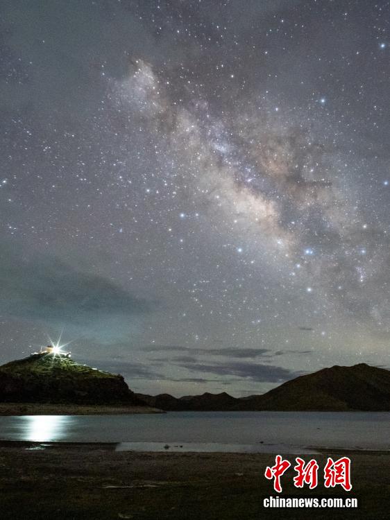 西藏山南羊卓雍錯(cuò)日托寺,因?yàn)楹0胃?、遠(yuǎn)離城市光污染,是理想的觀星之地。近日,海拔4400多米的寺廟夜空清澈,銀河清晰可見(jiàn),璀璨星辰與羊卓雍錯(cuò)相映成趣,吸引游客和攝影愛(ài)好者觀星拍攝。圖為日托寺(燈光處)上空銀河璀璨。江飛波 攝