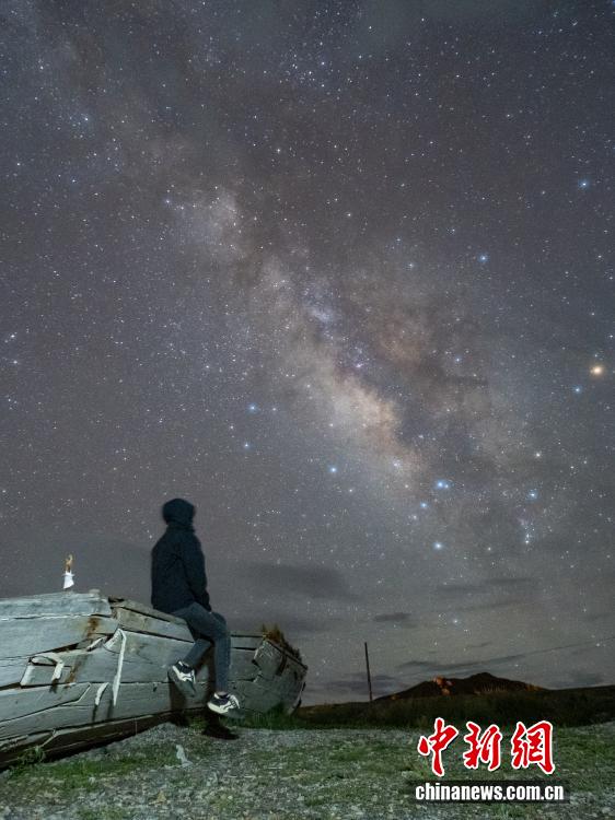 西藏山南羊卓雍錯(cuò)日托寺,因?yàn)楹0胃摺⑦h(yuǎn)離城市光污染,是理想的觀星之地。近日,海拔4400多米的寺廟夜空清澈,銀河清晰可見(jiàn),璀璨星辰與羊卓雍錯(cuò)相映成趣,吸引游客和攝影愛(ài)好者觀星拍攝。圖為游客在羊卓雍錯(cuò)日托寺附近與銀河“打卡”。江飛波 攝