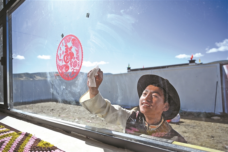 薩迦縣雄麥鄉(xiāng)扎果村群眾擦拭新家窗戶。記者 扎西頓珠 攝