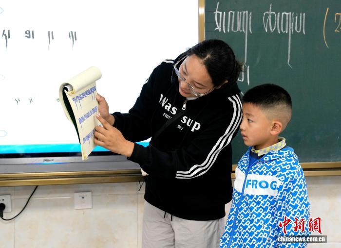9月1日,拉薩市第一小學(xué)一年級(jí)二班,藏語文老師扎西央欽正在輔導(dǎo)學(xué)生。近日,西藏拉薩市秋季學(xué)期開學(xué),各項(xiàng)教學(xué)工作有序開展。中新社記者 李林 攝