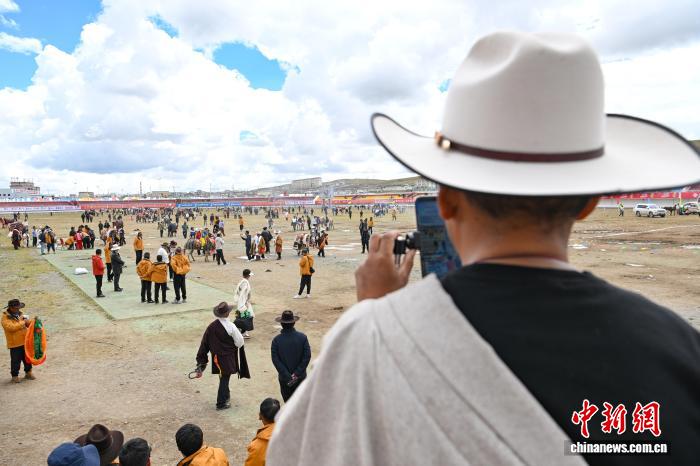 圖為當?shù)孛癖娪檬謾C直播恰青賽馬節(jié)傳統(tǒng)大跑決賽。中新社記者 貢嘎來松 攝