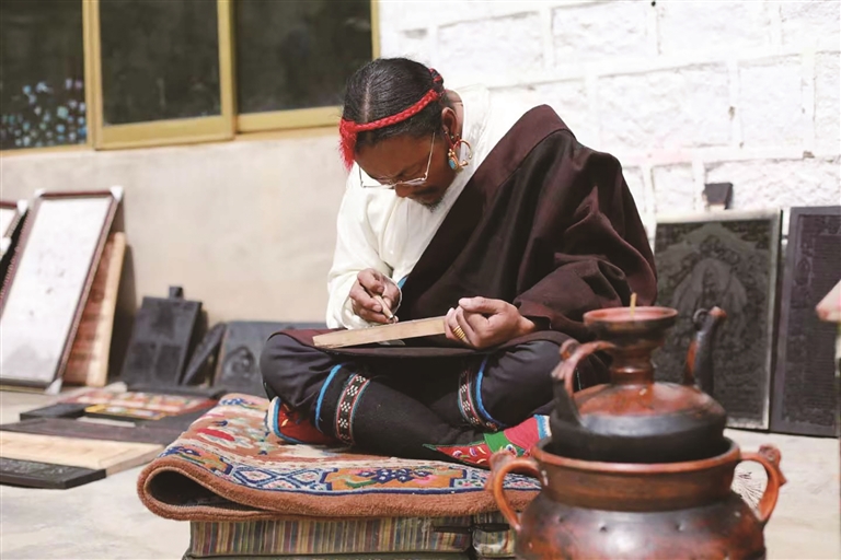 在傳承技藝的過(guò)程中,斯曲也面臨著不少挑戰(zhàn)。教徒弟時(shí)最大的困難就是讓他們靜下心來(lái),因?yàn)檫@門(mén)手藝需要從小學(xué)起,不僅要學(xué)習(xí)拿工具,還要學(xué)習(xí)認(rèn)字和雕刻?!耙郧肮馐菍W(xué)習(xí)雕刻文字,起碼要9個(gè)月時(shí)間,現(xiàn)在的孩子都很聰明,兩年基本就能掌握雕刻技藝?!彼骨牢康卣f(shuō)。