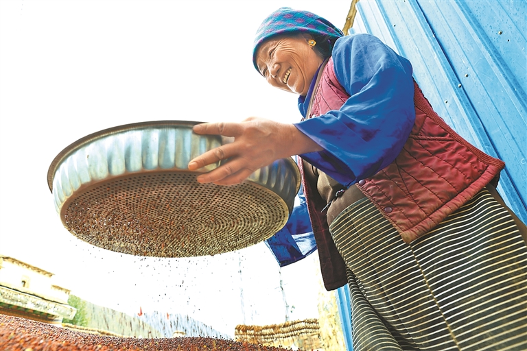 拉薩市墨竹工卡縣唐加鄉(xiāng)莫沖村村民正在篩菜籽。記者 旦增蘭澤 通訊員 洛克 攝