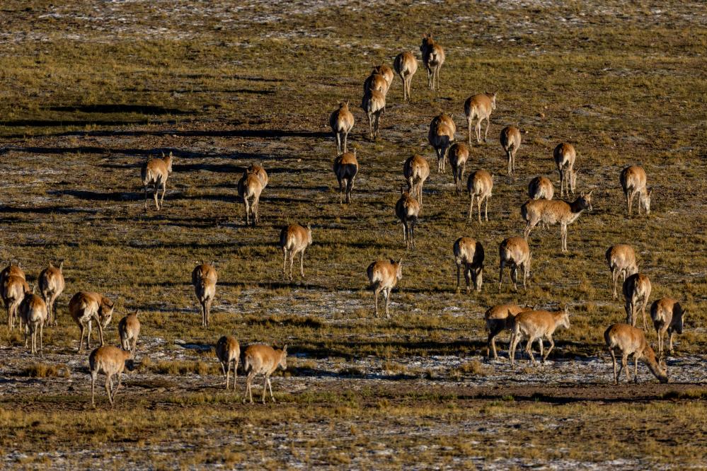 羌塘國家級自然保護(hù)區(qū)核心區(qū)繁殖遷徙路上的雌性藏羚羊群。(2025年6月10日攝)。新華社記者 姜帆 攝