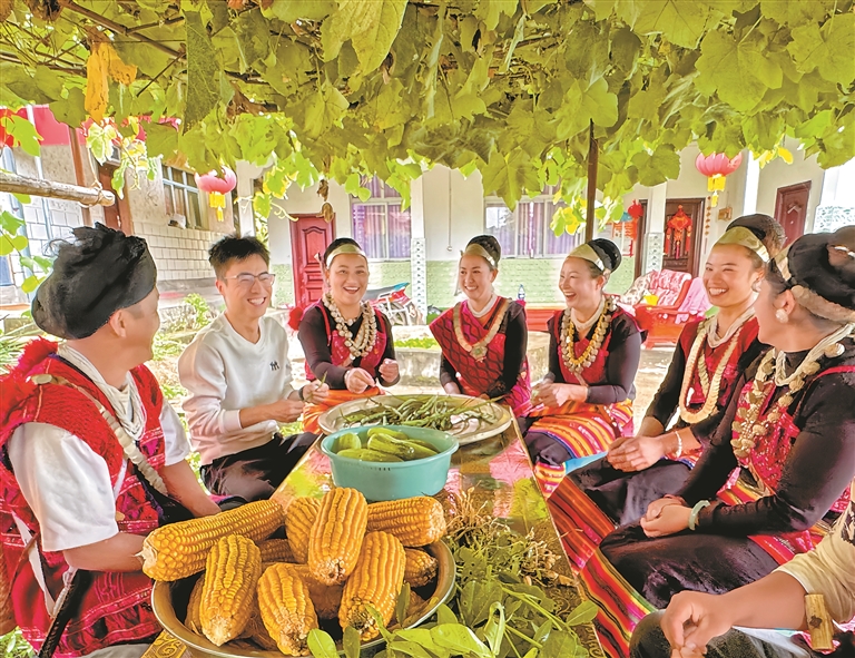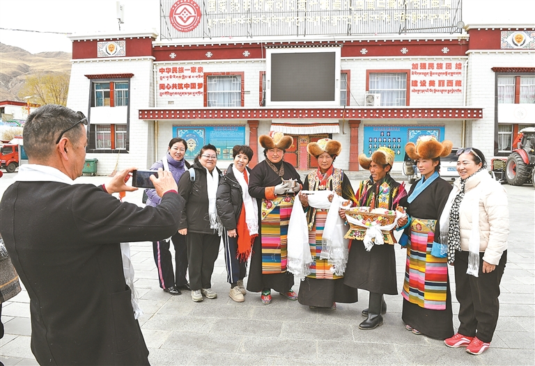 游客在山南市乃東區(qū)扎西曲登社區(qū)合照留念。
