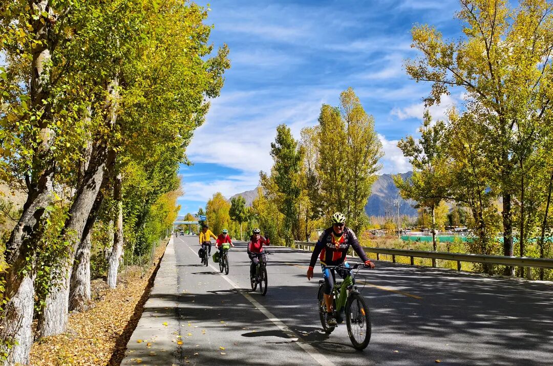 圖為自行車(chē)隊(duì)在拉薩市曲水縣秋意盎然的國(guó)道騎行。記者 次仁平措 攝