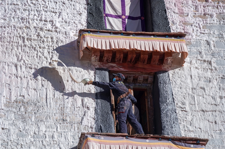 不遠處,安全繩在布達拉宮白色的墻壁上勾勒出利落的線條。工匠拿著長刷柄和噴槍,正仔細地粉刷著墻壁的各個角落。陽光刺眼,卻絲毫不影響他們手中利落的動作。