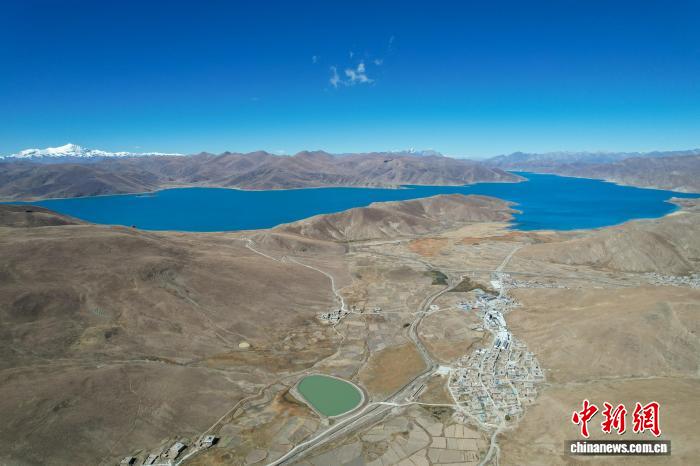 10月25日,西藏山南羊卓雍錯東北岸東拉鄉(xiāng)沿線風(fēng)光,遠(yuǎn)處雪山皚皚。(無人機(jī)畫面)中新社記者 江飛波 攝