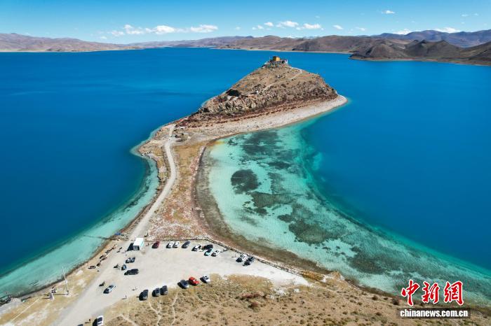 10月25日,西藏羊卓雍錯日托寺風(fēng)光。日托寺位于半島上,形成了“古剎”“孤寺”景觀,近年在網(wǎng)絡(luò)平臺持續(xù)火熱。(無人機(jī)畫面)中新社記者 江飛波 攝