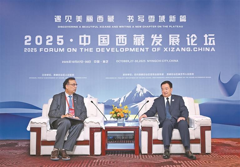 10月28日,自治區(qū)黨委書記王君正在林芝會(huì)見參加2025·中國西藏發(fā)展論壇的外國政要和駐華使節(jié)。這是王君正會(huì)見聯(lián)合國秘書長古特雷斯先生的代表,聯(lián)合國教科文組織駐華代表、東亞辦事處主任兼代表夏澤翰。本報(bào)記者 旦增西旦 攝