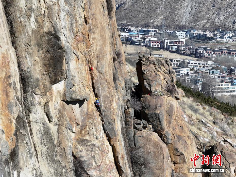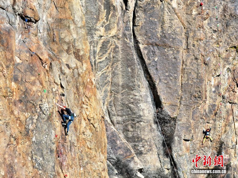 11月29日,2025西藏自治區(qū)攀巖自然巖壁公開(kāi)賽在拉薩市奪底溝吉倉(cāng)自然巖壁場(chǎng)地開(kāi)賽。來(lái)自中國(guó)全國(guó)的70名運(yùn)動(dòng)員、高校學(xué)生及社會(huì)攀巖愛(ài)好者參賽。(無(wú)人機(jī)照片)中新社記者 貢嘎來(lái)松 攝