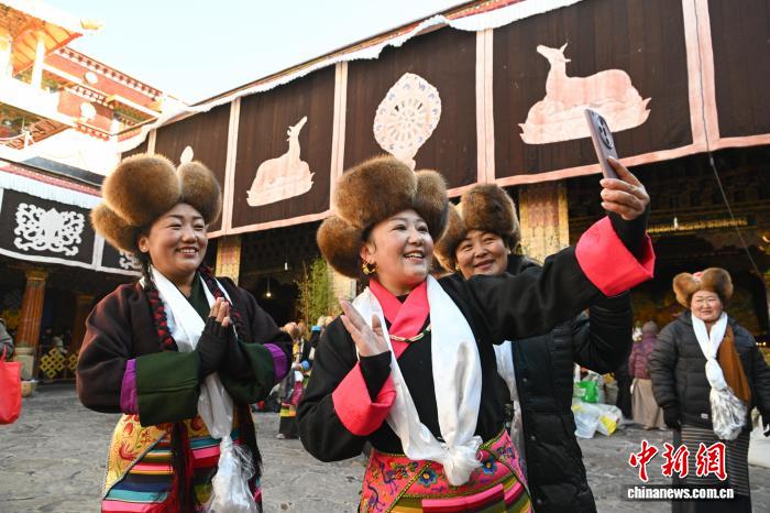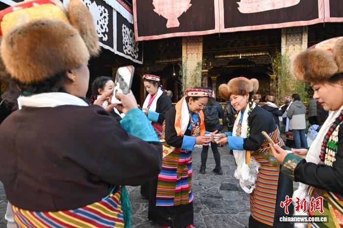 隨著藏歷十月十五白拉姆節(jié)(又稱“仙女節(jié)”)臨近,11月28日,西藏拉薩的婦女們?cè)诖笳阉绿陚鹘y(tǒng)舞蹈后自拍留念,迎接“仙女節(jié)”到來(lái)。“仙女節(jié)”即吉祥天母節(jié),藏語(yǔ)稱“白來(lái)日追”。相傳藏傳佛教最高護(hù)法神之一班丹拉姆的女兒白拉姆,不顧母親的反對(duì)與赤尊贊私定終身,班丹拉姆一怒之下將赤尊贊趕到拉薩河南岸,規(guī)定二人僅每年的藏歷十月十五日相見(jiàn)。中新社記者 貢嘎來(lái)松 攝