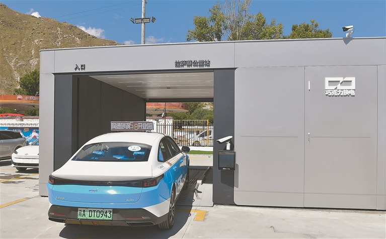 圖為拉薩市首批換電新能源出租車(chē)在換電。記者 白瑪澤旺 唐斌 攝