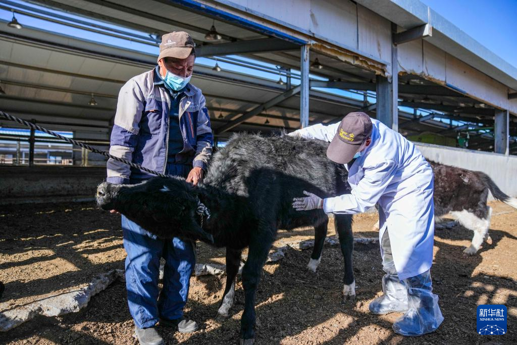 12月3日,西藏自治區(qū)動物疫病預(yù)防控制中心(區(qū)畜牧總站)曲水實驗站的工作人員在檢查克隆樟木牛母犢的身體狀況。新華社記者 丁增尼達 攝