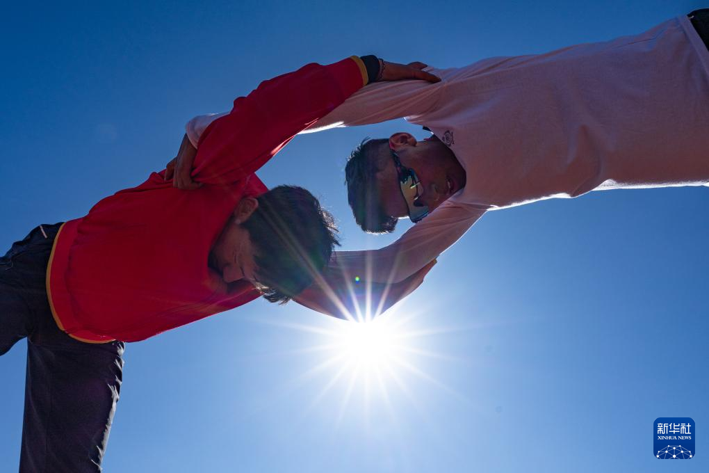 12月2日,索南加參(右)在西藏自治區(qū)競技體育管理中心和隊友一起拉伸。新華社記者 丁增尼達 攝