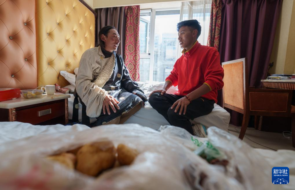 12月5日,索南加參(右)在拉薩的酒店房間中和父親次仁多杰聊天。新華社記者 丁增尼達 攝