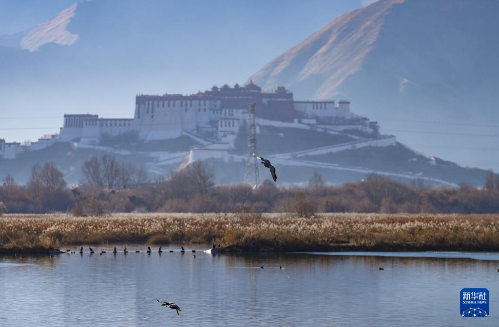 12月20日,斑頭雁飛翔在拉魯濕地上空。新華社記者 晉美多吉 攝