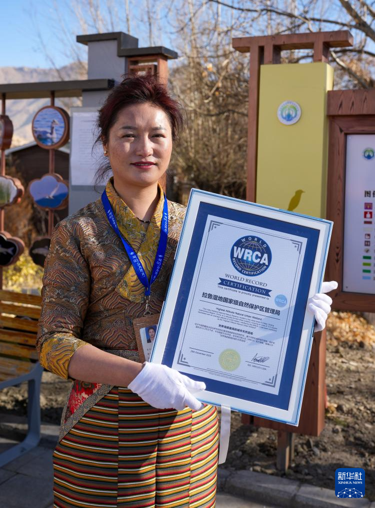 12月20日,拉魯濕地國(guó)家級(jí)自然保護(hù)區(qū)工作人員展示拉魯濕地獲得的“世界海拔最高的城市天然濕地”證書(shū)。新華社記者 晉美多吉 攝