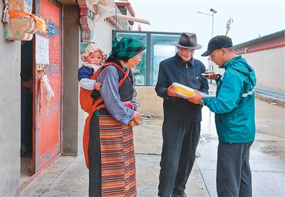 西藏山南市浪卡子縣普瑪江塘鄉(xiāng)平均海拔5373米,是我國(guó)海拔最高的行政鄉(xiāng),目前已實(shí)現(xiàn)包裹投遞進(jìn)村入戶。圖為村民領(lǐng)取網(wǎng)購(gòu)包裹。柏濱豐攝(人民圖片)