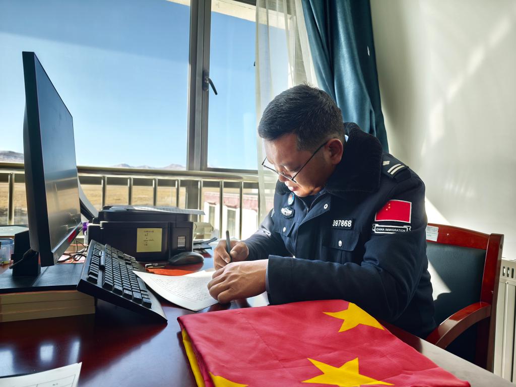 普瑪江塘邊境派出所所長普布扎西為海南大學愛心藝術團回信。(普瑪江塘邊境派出所供圖)