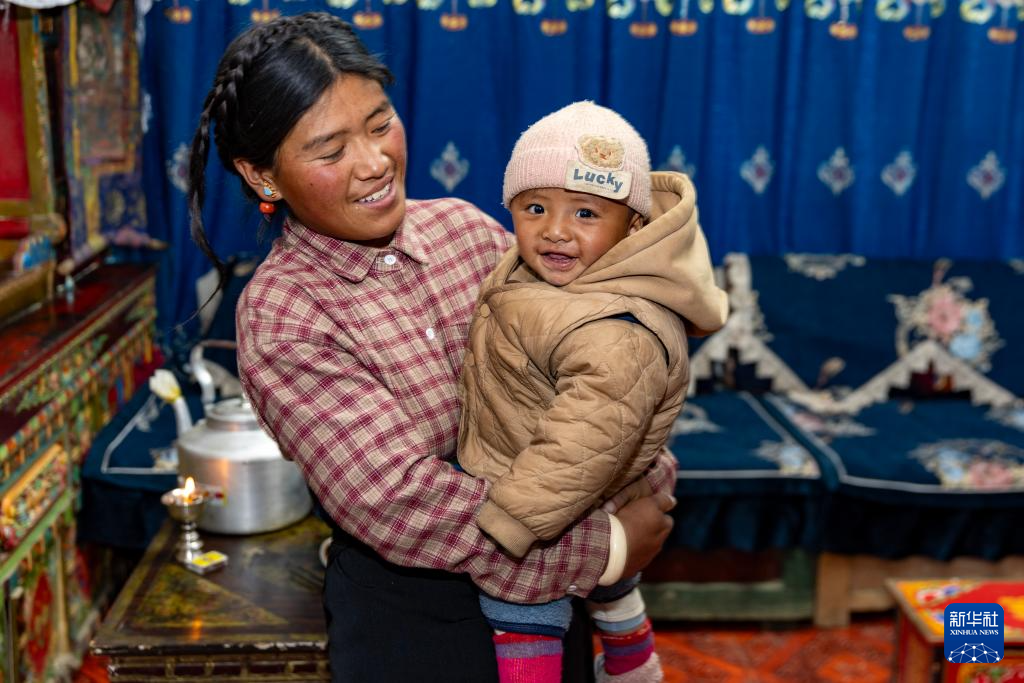 2025年11月11日,在西藏定日縣長(zhǎng)所鄉(xiāng)雜村,母親朋瓊在剛裝修好的新房中抱著次仁拉巴。新華社記者 姜帆 攝