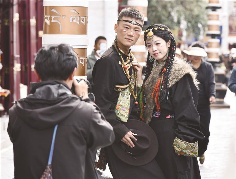 游客穿著藏裝在八廓街拍攝寫真。西藏日報記者 旦增蘭澤 攝