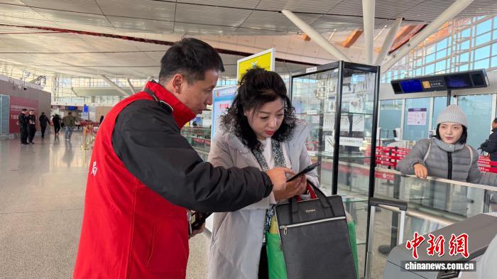 圖為在拉薩貢嘎國際機場,志愿者協(xié)助游客解決乘機問題。趙朗 攝