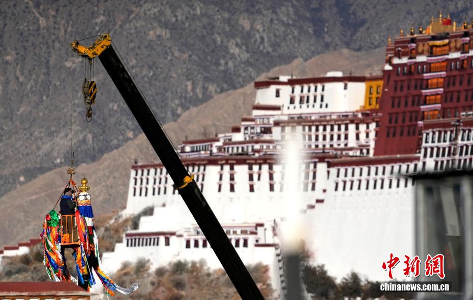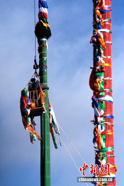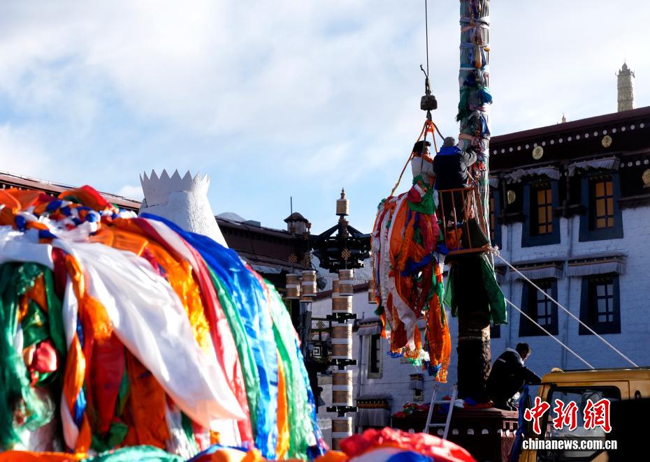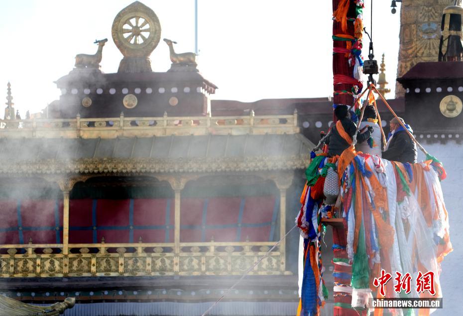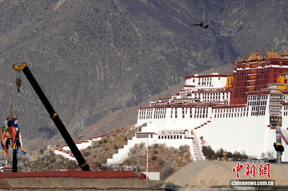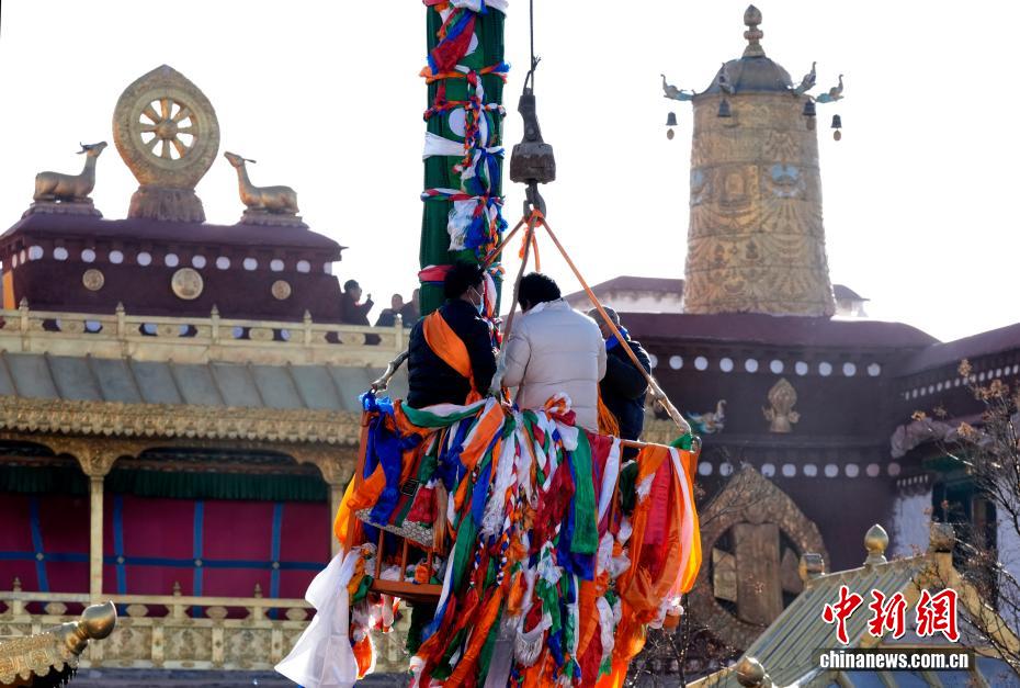 2月5日,西藏拉薩大昭寺的工作人員依據(jù)傳統(tǒng)為大昭寺周邊的5根高20多米的經(jīng)幡柱更換經(jīng)幡,迎接即將到來(lái)的藏歷新年。圖為工作人員乘坐吊車更換經(jīng)幡柱上的經(jīng)幡。中新社記者 李林 攝