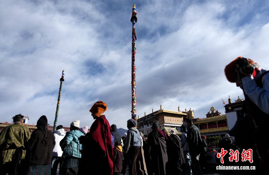 2月5日,西藏拉薩大昭寺的工作人員依據(jù)傳統(tǒng)為大昭寺周邊的5根高20多米的經(jīng)幡柱更換經(jīng)幡,迎接即將到來(lái)的藏歷新年。圖為更換經(jīng)幡儀式結(jié)束后,嶄新的經(jīng)幡柱屹立在大昭寺廣場(chǎng)。中新社記者 李林 攝