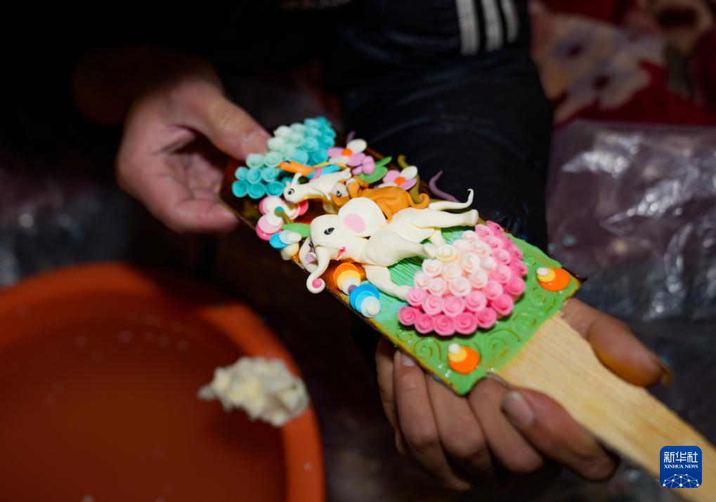 酥油花以色彩鮮亮的酥油為原材料,經(jīng)手工藝人在冷水里反復(fù)揉捏定型降溫后,用木刀精雕成日月星辰、花葉藤蔓及動(dòng)物造型,再拼接粘貼在盾形木板上,制作成栩栩如生的酥油花作品。