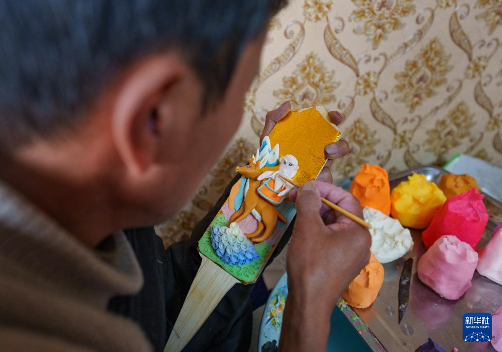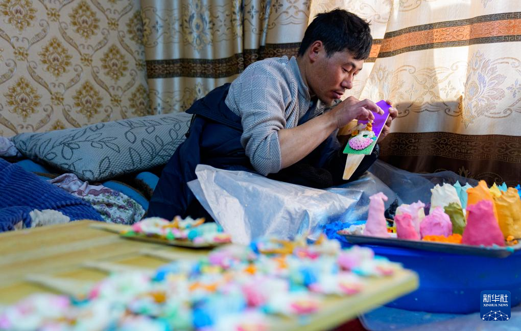 2月12日,在拉薩市林廓東路,來自西藏日喀則市仁布縣普松鄉(xiāng)的手工藝人羅布在制作酥油花。新華社記者 丁增尼達(dá) 攝