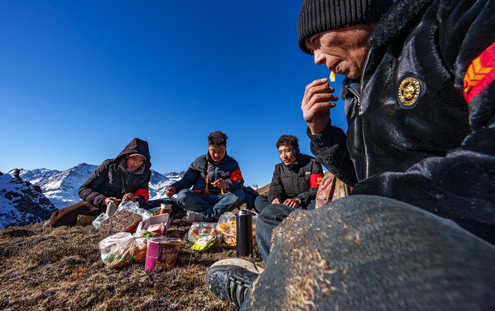 13時(shí)許,踏勘完日拉山頂10余公里的巡邊路線,護(hù)邊員們找到一塊沒有被積雪覆蓋的野草地,從背包里拿出食物,打開裝著熱水的保溫杯,一頓簡(jiǎn)單的午餐開始了。