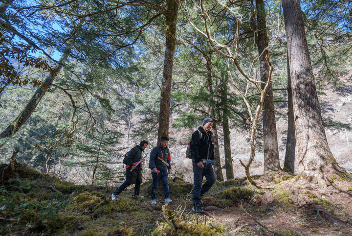 隨著海拔不斷降低,植被也越來(lái)越茂密。在密林里,道路七拐八繞。洛桑羅布抽出珞巴刀,不時(shí)砍去攔路的枝杈。