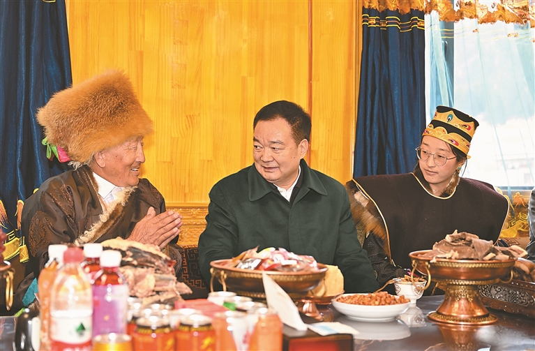 中華民族傳統(tǒng)節(jié)日春節(jié)剛過,雪域高原又迎來了藏歷新年初二,家家戶戶回蕩著“羅薩扎西德勒”的溫馨祝福?!斑^年了,祝你們新年快樂、身體健康、吉祥如意!”王君正走進(jìn)魯朗鎮(zhèn)扎西崗村77歲的老黨員、致富帶頭人平措家里,嶄新的香布、整潔的小院,切瑪斑斕、卡塞飄香,家里充滿濃濃的年味兒?!吧眢w怎么樣?”“民宿生意好不好?”在暖意融融的客廳里,王君正和老人聊家常,詢問身體狀況及家庭收入等情況,隨后走進(jìn)平措家的民宿旅館,從價(jià)格、住宿條件到屋外山景,看得仔細(xì)、問得深入。了解到在以習(xí)近平同志為核心的黨中央親切關(guān)懷下,扎西崗村發(fā)生了翻天覆地的變化,平措一家借助本地旅游資源,開民宿、做餐飲,年收入不斷增加,日子越過越好,王君正為他們的發(fā)展感到由衷高興、為他們的幸福生活點(diǎn)贊。他說,“看著北斗星走不迷路、跟著共產(chǎn)黨走會(huì)幸?!?,這些好日子,離不開以習(xí)近平同志為核心的黨中央對(duì)西藏工作的高度重視、對(duì)西藏各族人民的深切關(guān)懷,大家要感恩總書記、感謝黨中央,更加堅(jiān)定不移聽黨話、感黨恩、跟黨走;黨員要發(fā)揮先鋒模范作用,發(fā)揚(yáng)黨的光榮傳統(tǒng)和優(yōu)良作風(fēng),帶領(lǐng)村民用勤勞的雙手把家園建設(shè)得更加美好,把日子過得更加甜蜜。