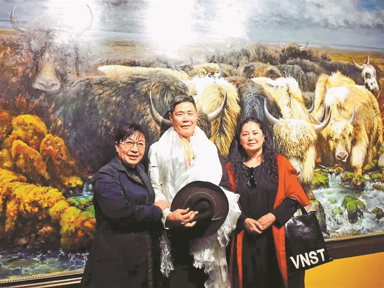 圖為唐瑟達(dá)娃(右一)和友人在畫(huà)展上合影。記者 盧文靜 攝