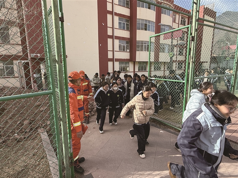 指戰(zhàn)員現(xiàn)場(chǎng)組織開(kāi)展地震應(yīng)急疏散演練。圖由卡若區(qū)消防救援機(jī)動(dòng)大隊(duì)提供