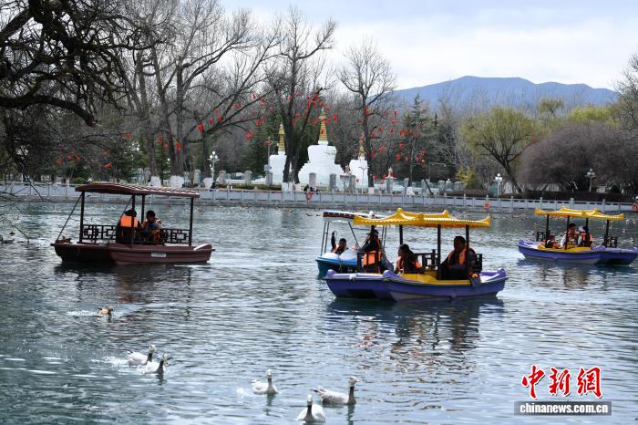 3月8日,西藏拉薩宗角祿康公園,市民乘游船賞春。陽春三月,古城拉薩楊柳發(fā)芽、桃花初放,春意漸濃。中新社記者 貢嘎來松 攝